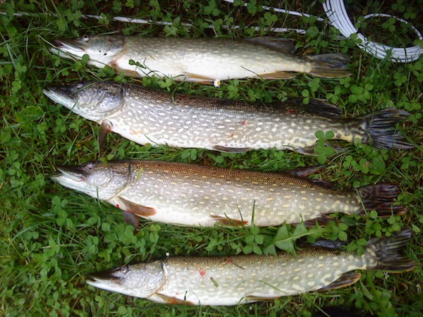 Hechtparade bei Thomas und Florian Hanseder. Sie fingen am 1.Juni 2010 innerhalb zwei 2h, 4 Hechte von 63cm, 68cm, 73cm und 81cm. Was für ein Anglertag (glück) !!! |